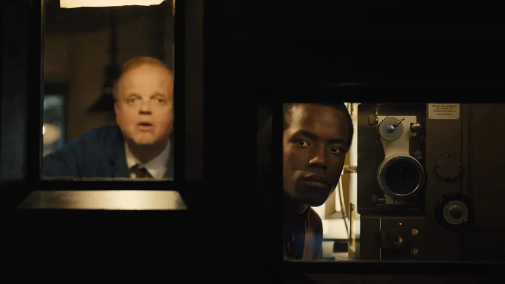 La relación entre Hilary y Steven también está limitada por este lugar, pues es donde tienen que esconder su relación, centrándola en la parte abandonada del cine y en la azotea, mientras que la escena de la playa, las visitas al hospital o la escena las piedras, sí que les concede momentos cómplices y de conexión, y todas ellas suceden fuera del cine. Puede parecer entonces que la magia sucede dentro de la propia sala, y de hecho la película, desde su título, parece intentar ir ahí, al lugar donde luz y oscuridad convergen, sin embargo, este concepto se pierde en la presentación de la misma al centrarse en lo que ocurre después de la proyección, una sala vacía y varios trabajadores que tienen que quedarse hasta tarde para dejarla preparada para la siguiente sesión. A esto se suma uno de los momentos de mayor catarsis de Hilary en el cual ha de salir huyendo del cine. Es solo al final de la película cuándo la sala tiene un breve momento de esplendor, cuando Hilary ve una película por primera vez, momento en que esa magia parece relucir de nuevo.