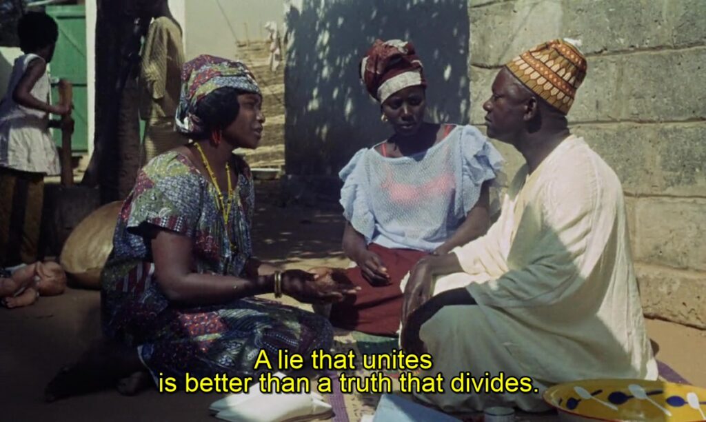 Como antes he mencionado, contiene a color esa luminosidad característica suya tan maravillosa que parece incidir como un sol platónico en una verdad que la historia ya nos cuenta, y que nos encandila visualmente, con una utilización colorista sin precedentes en el continente africano (si acaso su compatriota Djibril Diop Mambéty la alcanzaría unos años más tarde). El despliegue de vestimentas contrastadas con las arenas de las calles, las joyas y colgantes con las pieles, los tejidos y los utensilios con los pardos interiores… es de un gusto exquisito. Además, el diseño artístico es maravilloso, y lo vemos más fehacientemente en el contraste entre los interiores de las casas adineradas y pobres de Dakar.