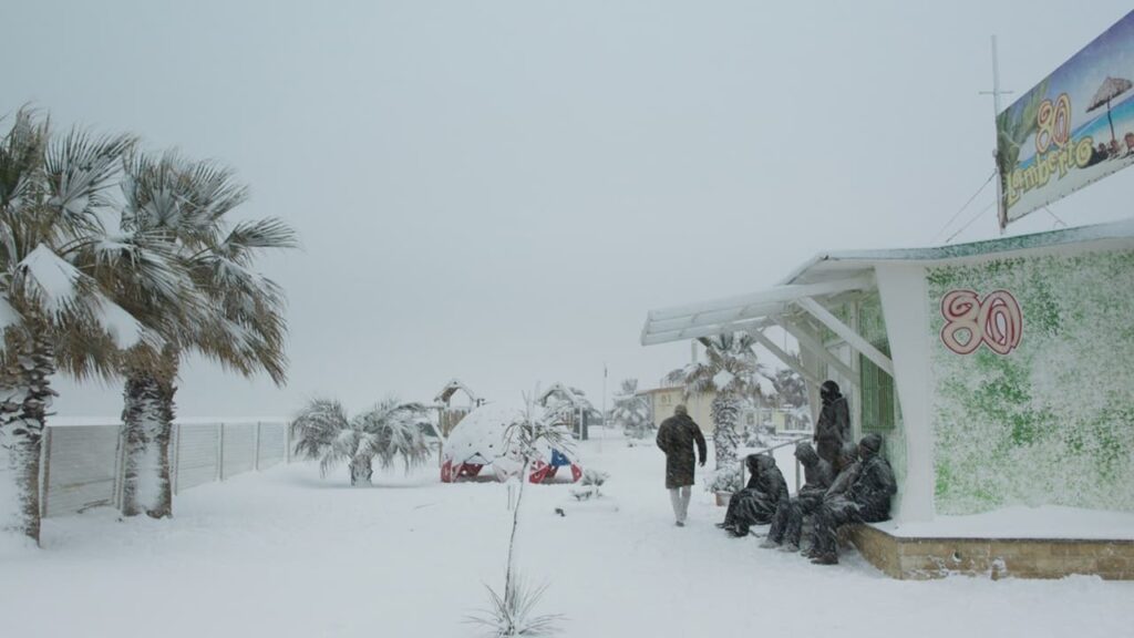 El pasillo de una residencia, un vinilo de pájaros volando en la ventana, puertas pintadas con papeles de distintos motivos, y un hombre que, ayudado por un andador, busca una puerta que se abra, pero ninguna lo hace. Estos elementos abren la escena, y después de esto, su título, Rimini. Este hombre que, en la cinta, es el padre del protagonista, será el hilo conductor de la misma, empezando y terminando con él. En sus brevísimas apariciones servirá a la vez de síntesis de la película, como de escape poético.