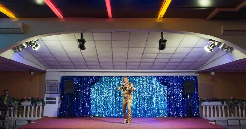 Tras el título, aparece finalmente Richie Bravo, y empieza la historia tras esta introducción. Una película construida visualmente a través de puntos de fuga y la ausencia de estos. La composición de la imagen está siempre formada por dos paredes, o, a falta de estas, elementos laterales, los cuales no han de ser muy grandes o marcados necesariamente, pero componen la imagen haciendo este efecto “túnel”. El punto de fuga, en vez de actuar como símbolo de escape, actúa como lo contrario, como camino marcado por el cual el protagonista va vagando a lo largo de la película sin siquiera planteárselo, convirtiéndose él mismo por momentos, junto con su hija, en una de estas “paredes compositivas”. Esto se puede interpretar como una puesta de intenciones de Seidl, quien manipula a los personajes para conseguir esa rigurosidad compositiva, dejando claro que lo que importa no son ellos, es Rimini. Como contrapunto, la anulación de los puntos de fuga. Las paredes se alzan como bloques lisos sobre el personaje, unas paredes que no tendrán ninguna perspectiva, ninguna esquina, abarcan todo el plano posicionándose a la espalda de Richie, siempre muy cerca de este. Seidl deja a su protagonista contra la cámara o la pared. En los momentos en que esta regla no se cumple, unos intensos contrapicados llevarán el plano del cantante, acercándole visualmente al techo y aportando una sensación claustrofóbica.