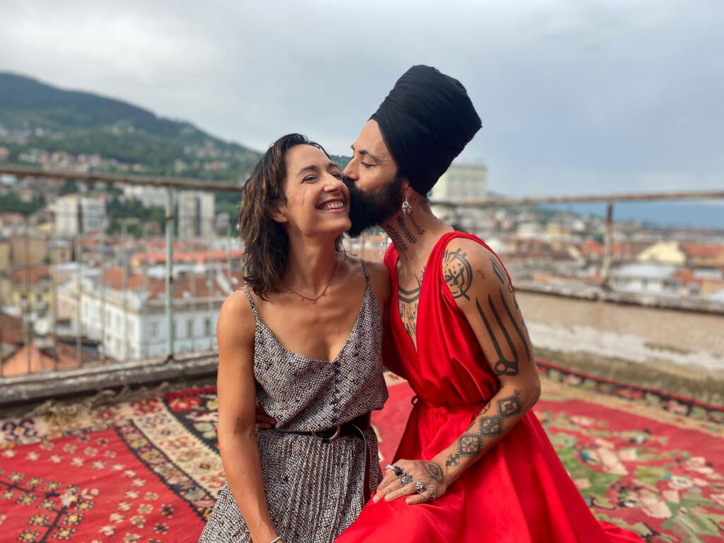 Raúl: Božo es una persona muy muy especial, muy delicada, y también es un volcán. Pero para mí como director junto con Amaia, sobre todo es un artista y es el protagonista de nuestra película. Creo que siempre le he mirado con ojos de director a artista. Creo que los grandes artistas saben cuándo tienen que darte lo mejor de sí. Suele ser un efecto muy efímero, muy breve, y tienes que estar atento para aprovecharlo. Božo me sugirió sobre todo autenticidad y delicadeza. Me encantaba la manera en la que él de alguna forma se hacía fuerte en su terraza. En lo alto de aquel edificio, era como su castillo, como una princesa de los cuentos medievales. Él adora la ciudad de Sarajevo, pero por otra parte le gustaba mucho estar en su terraza donde se sentía tranquilo. Le gustaba muchísimo mirar la ciudad, la ciudad otomana, la ciudad judía … Su terraza fue para nosotros el campo base. También es una persona muy valiente y creo que lo demuestra, eso le trae a veces enemigos. Él tiene haters y personas que le odian porque no conciben a alguien tan libre y tan puro. Božo, como él bien dice, es hombre y mujer a la vez, y lo percibes cuando estás con él, incluso es niño también, y también es un alien. Es un tipo que creo que como personaje de nuestro corto Maldita es buenísimo, muy poliédrico y fascinante. A mí me pasaba mucho en montaje junto con Amaia que nos quedábamos mirando cada uno de sus gestos.